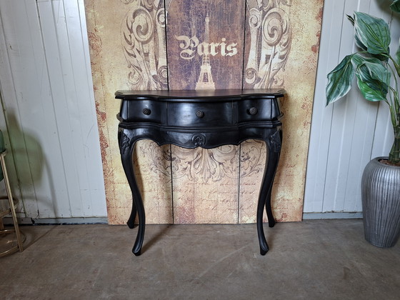 Table d'appoint noire, console murale de style baroque ou Queen Anne, dimensions : 78 x 39 cm et 79 cm de hauteur.