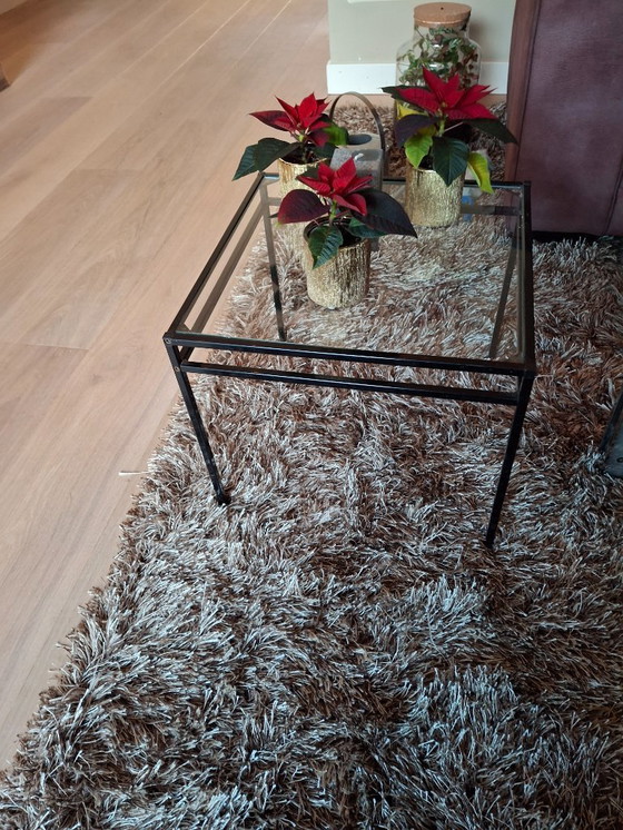 Table d'appoint en verre sur pieds fins laqués noirs. Style industriel et minimaliste, d'une grande élégance.
