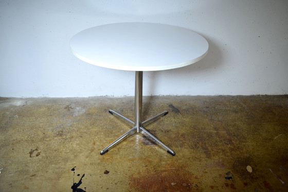 Voici une table Space Age simple avec un piètement chromé et un plateau léger. Son design épuré permet une utilisation polyvalente comme table d'appoint. Son diamètre est suffisamment large pour accueillir un petit ordinateur portable, par exemple.