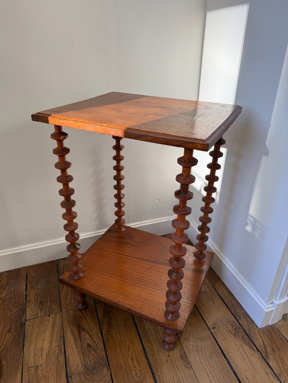 Cette élégante table d'appoint en bois témoigne du design des années 50. Avec ses lignes épurées et son style Art déco, cette pièce apportera une touche sophistiquée à votre intérieur. Les étagères en bois et les pieds en forme de bobines ajoutent une touche originale et unique à cette sellette.