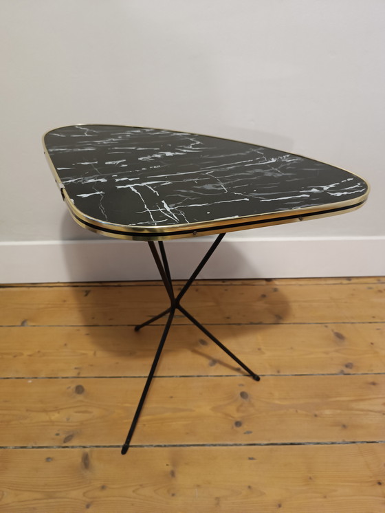 Plateau en plastique, dessous en bois aggloméré, bordure en laiton, piètement en métal avec embouts.