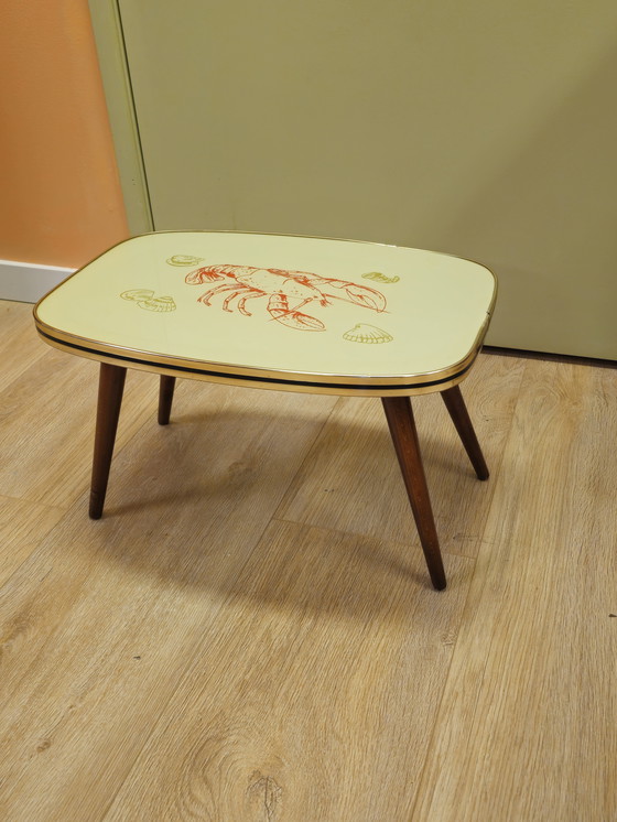 Table d'appoint vintage avec plateau en verre orné d'un homard et de coquillages sur fond jaune clair. La table présente un passepoil couleur laiton avec une rayure noire et des pieds fuselés.
