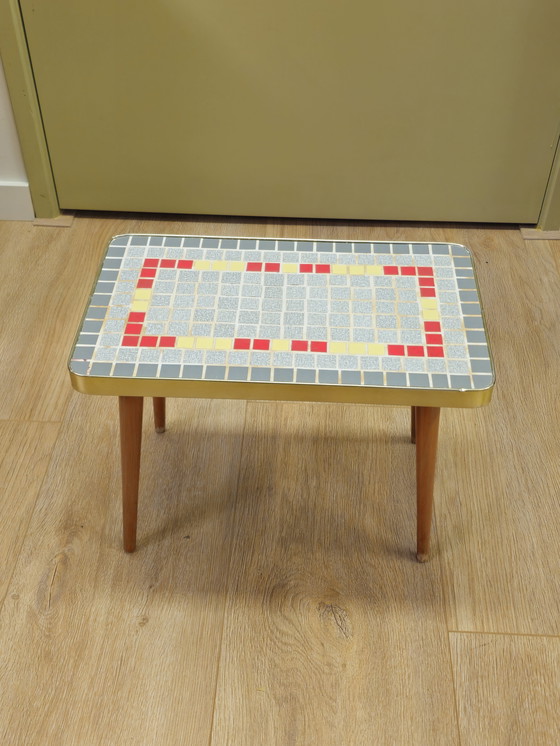 Table d'appoint vintage avec "aspect mosaïque" en Formica, pas en pierre. La table a un passepoil couleur laiton et des pieds effilés. Avec une étiquette au dos.