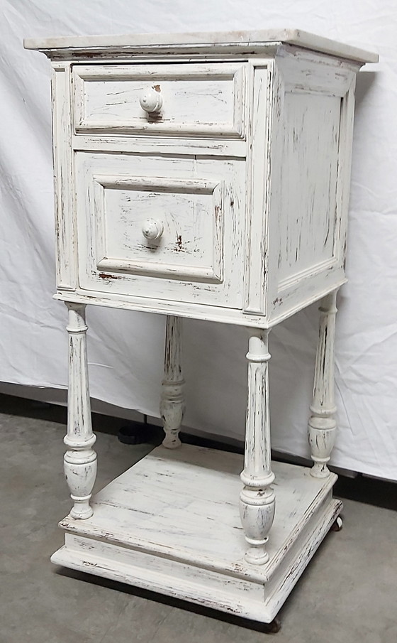 Cette table de chevet antique est un meuble magnifiquement restauré avec un élégant plateau en marbre. Le meuble a un aspect vintage avec sa finition blanche et ses pieds détaillés. Il offre un grand espace de rangement avec deux tiroirs, parfaits pour ranger des objets personnels près du lit. Le dessus en marbre ajoute une touche de luxe à l'ensemble. Idéal pour les amateurs de meubles anciens et uniques.