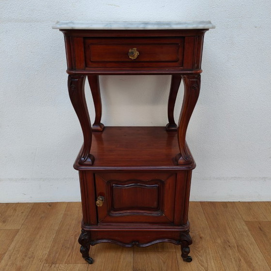 Cette table de chevet haute ancienne, de style français vintage, possède un plateau en marbre blanc. Elle est dotée d'un tiroir dissimulant un placard, et d'une petite niche entre le tiroir et le placard. Le placard conserve son insert en porcelaine d'origine. Élégante et raffinée, elle sera parfaite comme table d'appoint près d'un canapé, meuble d'entrée ou, bien sûr, comme table de chevet. Le placard repose sur ses roulettes d'origine. Un petit morceau est manquant sur la moulure décorative située dans l'angle arrière gauche. Des photos claires le montrent. Une fois le placard en place, ce défaut est à peine visible.