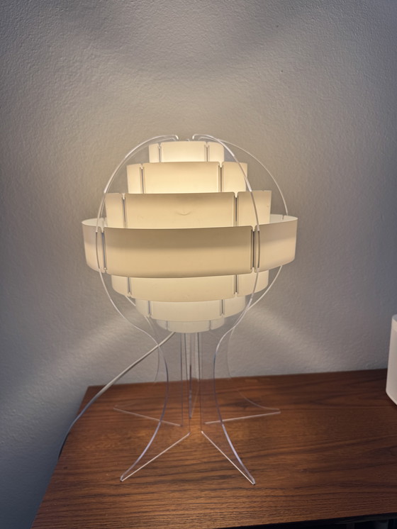 La lampe présente une structure architecturale audacieuse, composée d'éléments en acrylique translucide imbriqués et agencés en une composition géométrique et superposée. Allumée, elle diffuse une lumière chaude et douce, créant une ambiance apaisante tout en soulignant sa silhouette futuriste, presque organique. Le pied en acrylique transparent renforce cette impression de légèreté, donnant à la lampe l'impression de flotter.