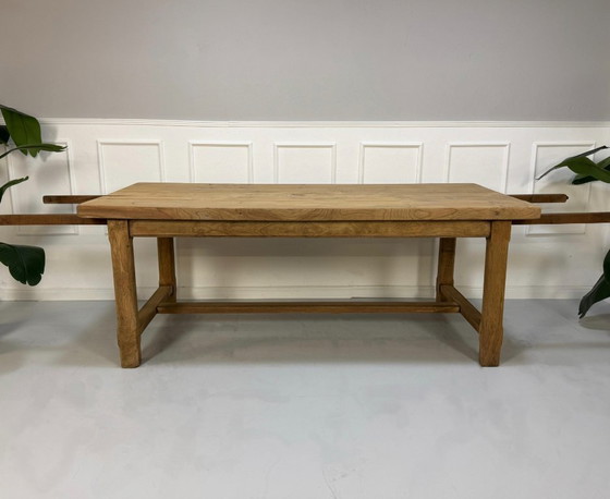 Cette table de ferme ancienne, d'origine française, présente un large plateau en orme et une structure en chêne. Entièrement réalisée en bois brut, elle peut accueillir confortablement six à huit personnes.