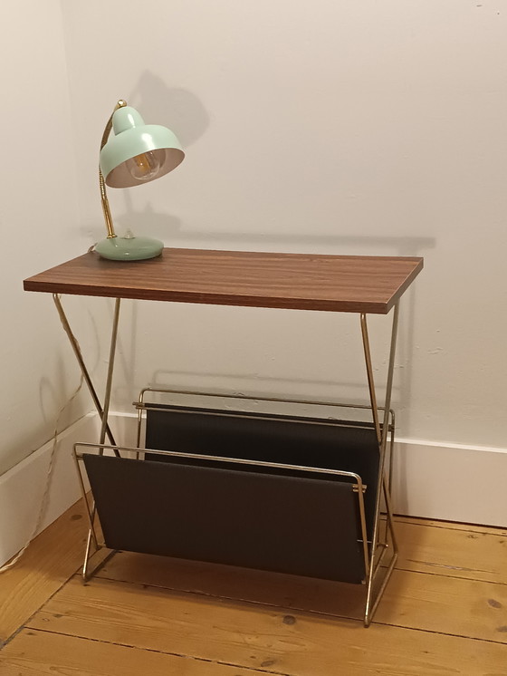 Table de lecture/table d'appoint vintage très tendance +++ Années 70 +++ Structure en métal, plateau en placage, panier en similicuir +++ Plateau, bords et dessous en placage en parfait état. Structure et similicuir en excellent état vintage.