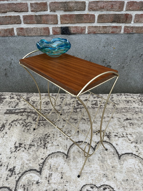Table de lecture vintage Mid Century, cadre en métal doré orné avec plateau de table en teck sur le dessus. Mobilier typique du Mid Century français en acier des années 1960 en bon état vintage. Hauteur 44cm, plateau 38cm x 22cm, surface de lecture 27cm de large.