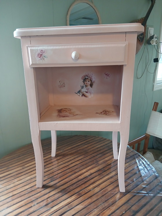 Découvrez cette charmante table de nuit pour enfant, soigneusement relookée pour apporter une touche de douceur et d'élégance à la chambre de votre enfant. Sa finition rose pastel, ornée de délicates illustrations florales et de motifs enfantins, évoque un style vintage plein de charme.