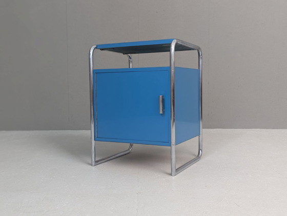 Fabriquée avec une structure en acier tubulaire chromé et un meuble en bois laqué, cette pièce est finie dans un riche bleu Bauhaus qui évoque l'esthétique audacieuse et rationaliste de l'époque. La laque et le chrome ne présentent que des signes mineurs d'âge, et la structure générale est solide et entièrement fonctionnelle.