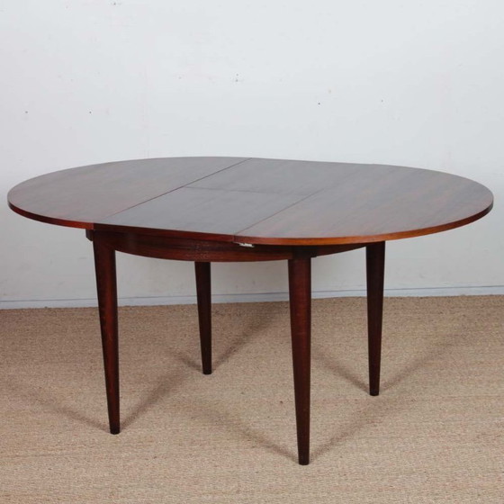 Cette table de repas extensible en palissandre de Rio est une production française des années 1960. Elle dispose d’une rallonge intégrée de 45 cm sous le plateau, permettant d’augmenter facilement sa capacité d’accueil. Le plateau a été restauré afin de préserver la beauté du palissandre et d’offrir une finition soignée.