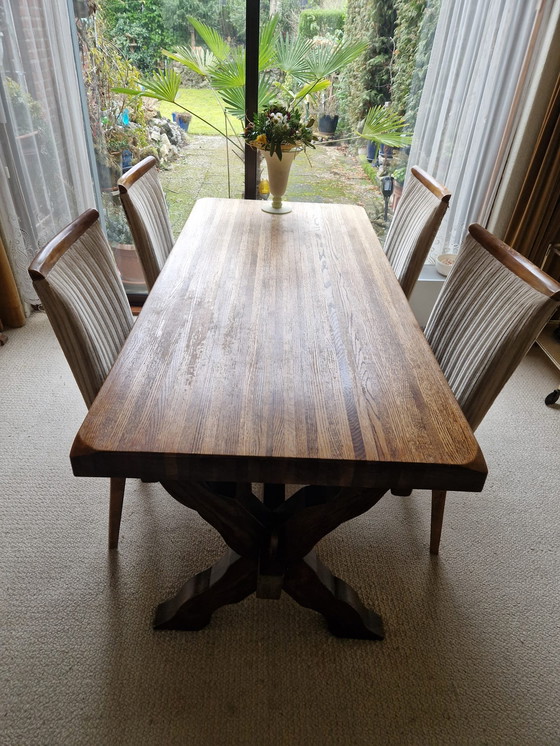 La table à manger appartenait à mes parents. Il s'agit d'une table en bois de chêne massif.