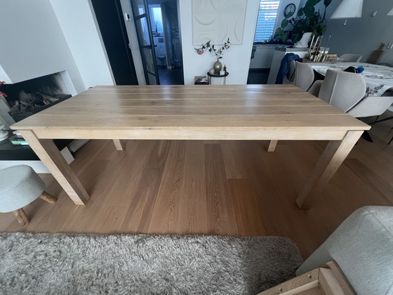 Table de salle à manger en chêne massif de Keijser en Co. Cette table de dimensions fixes (91 x 200 cm) est dotée de deux rallonges de 50 cm chacune, permettant d'étendre sa longueur jusqu'à 250 cm, voire 300 cm. Ses pieds sont facilement démontables.