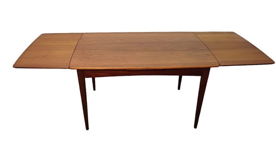 Table de salle à manger en teck, avec un plateau élégamment incurvé et deux rallonges de 45 cm, Danemark, années 1960.