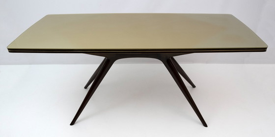 Table de salle à manger en noyer foncé avec plateau en verre bronzé italien dans le style Ico Parisi des années 50. La table a une belle forme sculpturale. La table a été polie à la gomme-laque en conservant la patine d'origine. Le plateau en verre a une teinte dorée et présente deux éclats qui n'affectent pas la stabilité du verre et sont à peine perceptibles. Veuillez vous référer aux photos.