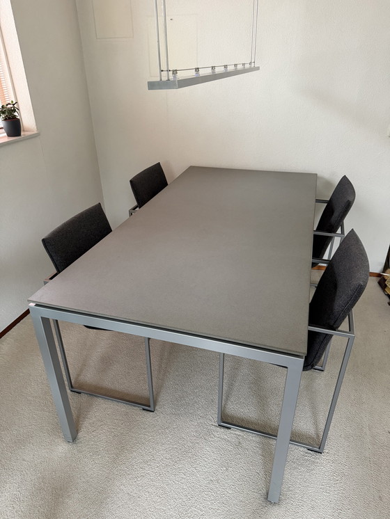 Magnifique et très robuste table Metaform S16 avec un plateau en pierre dure Pietra Serena de 20 mm d'épaisseur aux bords biseautés. Pieds en aluminium RAL 9006. La table mesure 180 x 90 cm et 75 cm de haut. Elle est vendue avec quatre chaises de salle à manger Arco, chacune dotée d'une structure métallique en aluminium et revêtue de tissu Kvadrat Divina Melange coloris 170 gris anthracite. Au-dessus de ce bel ensemble est suspendue une lampe Ferrolight Solid équipée de sept ampoules de 20 watts. Cette lampe à double suspension mesure 150 cm de large et s'allume et s'éteint à l'aide d'une télécommande. La télécommande fonctionne encore, mais devrait être remplacée (voir photo). La table, les chaises et la lampe peuvent également être vendues séparément. Cependant, l'ensemble forme un tout harmonieux et est donc privilégié.