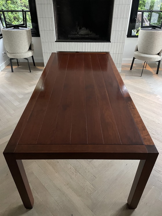 Cette table rectangulaire peut accueillir 3 chaises de chaque côté. C'est une table très robuste. Le bois est bien épais et les pieds sont droits. Un spécimen intemporel.