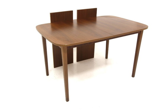 Table de repas en noyer produite en suède dans les années 1960. En excellent état avec de minimes marques d'usures. Conforme à l'état vintage. Piètement en hêtre. Fournie avec 2 rallonges de 33cm. Longueur avec rallonges 190cm. 24660