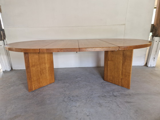 Table de salle à manger extensible vintage en bois massif xl design. Une belle table extensible avec un plateau en bois massif de pas moins de 4,5 cm d'épaisseur. La table a un diamètre de 135 cm lorsqu'elle est pliée et peut être allongée à 180 cm ou 225 cm. Le plateau est légèrement endommagé, mais il est en bon état. 76 cm de haut. Les pieds peuvent être détachés pour le transport.