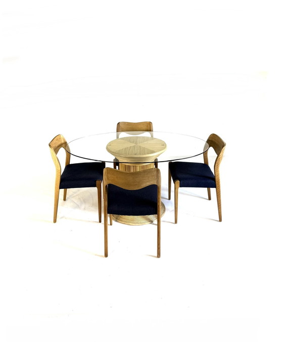 Table de salle à manger vintage avec un élégant piètement en rotin et un plateau ovale en verre. Un design raffiné, gracieux et élégant. Le plateau ovale à facettes est remarquablement bien conservé et en excellent état.
