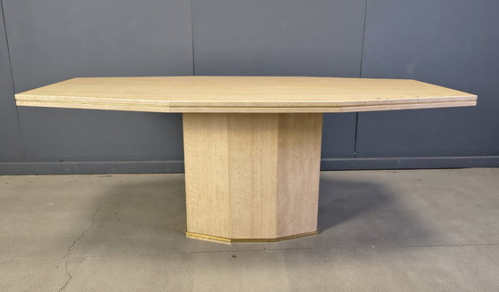 La table possède un plateau épais et résistant et un unique pied central en travertin.