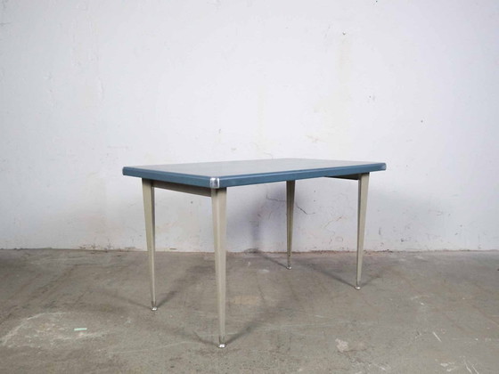 Cette table à manger vintage des années 1960 incarne le charme intemporel du design Mid-Century Modern. Avec son élégant plateau bleu et ses robustes pieds en métal gris, elle s'intègre harmonieusement à tout intérieur raffiné.