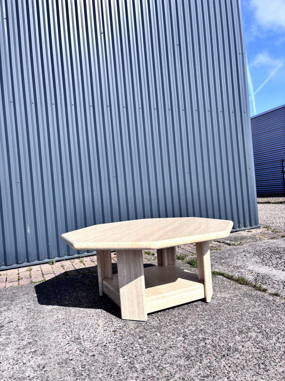 Cette exquise table basse vintage en travertin témoigne d'une élégance intemporelle et d'un design raffiné. Sa forme octogonale unique et sa finition en pierre naturelle en font une pièce maîtresse remarquable pour tout espace de vie, s'harmonisant avec les intérieurs modernes et classiques.
