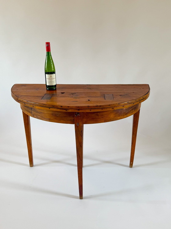 Cette charmante table demi-lune du début du XIXe siècle est fabriquée en pin et a développé une belle patine authentique au fil du temps. La construction présente une menuiserie raffinée et des charnières bien conservées, ce qui permet au plateau de se plier et de se transformer d'un cercle complet en une forme classique de demi-lune. Son design polyvalent permet de la placer contre un mur ou de la placer librement au centre d'une pièce. Une pièce intemporelle et fonctionnelle au caractère discret.