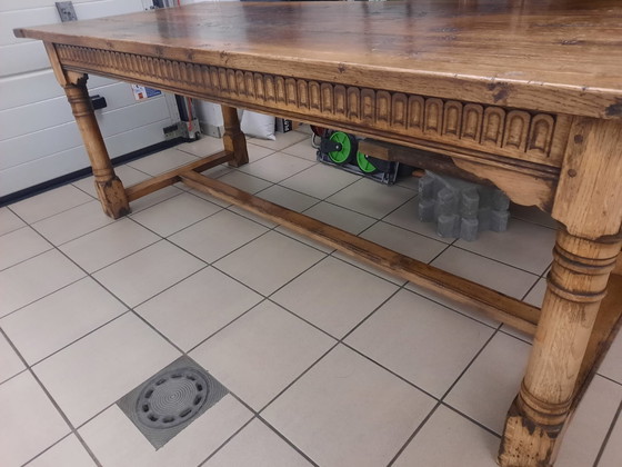 Cette magnifique table en chêne datant de la fin des années 1980 est une trouvaille vintage unique. Avec une bordure décorative et une taille généreuse de 210 cm x 85 cm, cette table offre beaucoup d'espace pour des dîners agréables. La table est livrée avec deux rallonges de 50 cm chacune, ce qui la rend encore plus polyvalente. Malgré son âge, la table est en excellent état et ne présente que de légères traces d'utilisation. Un complément idéal pour tout intérieur qui a besoin d'une touche de charme classique.