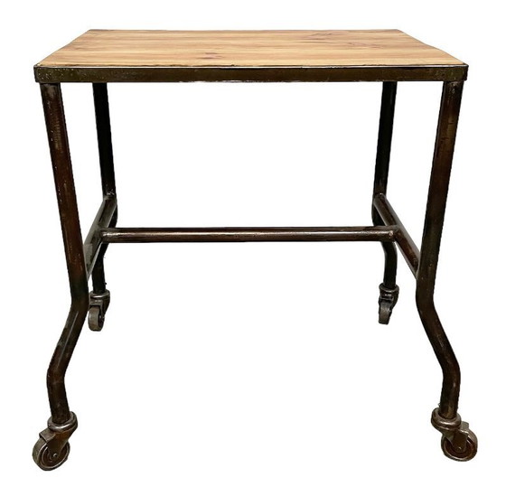 Table industrielle des années 1960. Elle présente une structure en fer, quatre roulettes d'origine et un plateau en bois massif. Son poids est de 7 kg.