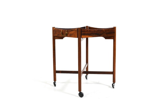 Magnifique table d'appoint en bois foncé et éléments en formica noir. Poignées en laiton. Design de Mogens Lysell. Plateau réversible. Pied pliable. Roulettes ajoutées ultérieurement. Possibilité de retirer les roulettes. Très bon état vintage. Légères marques d'usure et signes d'ancienneté normaux. Prête à l'emploi.