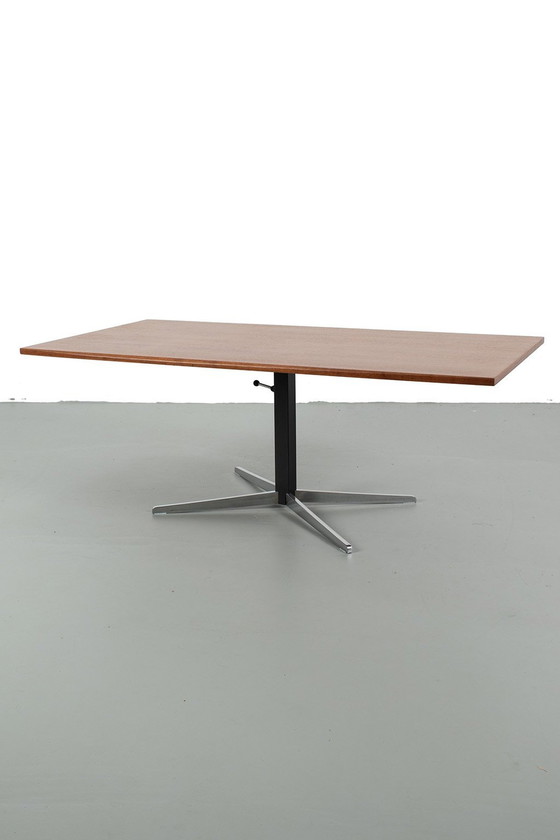 Table réglable Wilhelm Renz pour les amateurs de design minimaliste subtil. La hauteur de la table est facilement modifiable à l'infini pour en faire une table basse ou une table de salle à manger. Le plateau a été repeint. En bon état.