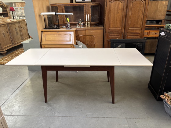 Cette table de salle à manger vintage présente un design classique avec un plateau de couleur crème et des pieds en bois marron. Elle est parfaite pour ajouter une touche de charme rétro à votre salle à manger. La table est extensible, ce qui la rend polyvalente pour les petits et les grands rassemblements. Malgré de légères éraflures, elle est encore en bon état et offre à la fois fonctionnalité et style.