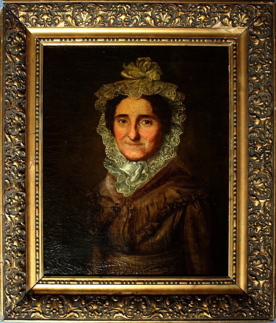 Tableau à l'huile ancien encadré d'or représentant le portrait d'une dame au chapeau