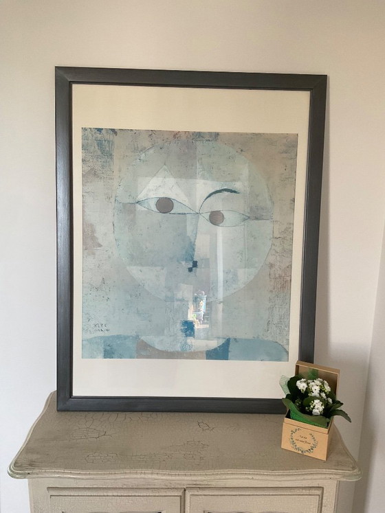 Très beau tableau décoratif inspiré du style de Paul Klee, représentant un portrait abstrait aux tons doux (bleu, beige, gris).