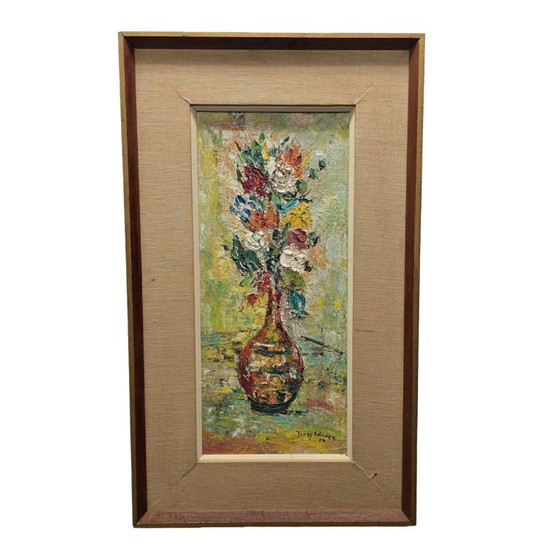 Cette peinture florale vintage et atmosphérique de Pansy Schenck (1959) représente un vase expressif contenant un bouquet de fleurs multicolores. La précision du coup de pinceau crée une belle profondeur et une texture palpable. L'œuvre est signée et datée de 1959 en bas. Bien que Pansy Schenck soit une artiste relativement peu connue, son travail témoigne d'un grand savoir-faire et d'une profonde sensibilité artistique.