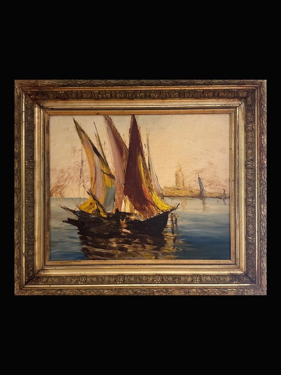 Très beau tableau impressionniste marin représentant un voilier dans un port de Méditerranée. Huile sur panneau. Technique exceptionnelle jusque dans les moindres détails y compris les reflets dans l’eau. Magnifique et lourd cadre en bois doré d’origine très épais et profond. L’œuvre n’est pas signée, et je ne suis pas en mesure de la dater. Elle est très ancienne dans tous les cas. L : 58cm H : 50 cm P : 6,5 cm