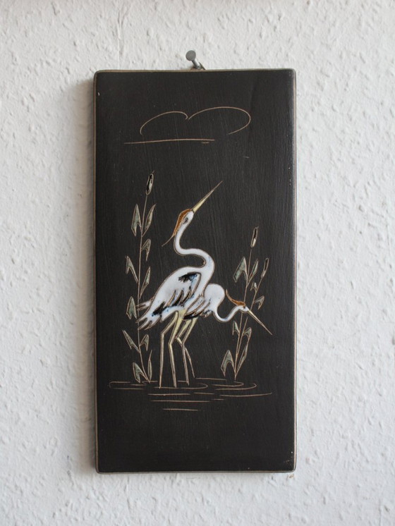 Tableau mural en céramique Ruscha, 2 grues dans des roseaux, fait main, signé au dos, années 1960