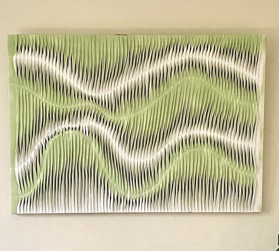 Tableau sculpture textiles effet de vague et de relief par plissage multicolores Contemporain. Réf DOVE Tableaux peint et à partir d'un pliage à répétition, et de façon aléatoire aux rythmes des lignes horizontales des images abstraites se forment et nous invitent à une balade visuelle toute en douceur. Le tableau évoque pour moi la fluidité du temps doux. Variation de formes et de couleurs toujours en mouvements au rythme des déplacements dans la pièce et exposition de la lumière. Chaque tableau est unique et raconte une histoire toujours différente. Toile sur châssis en bois de 93cmX65cm X5cm. Dans l'air du temps, le tableau texturé est l'une des dernières tendances.