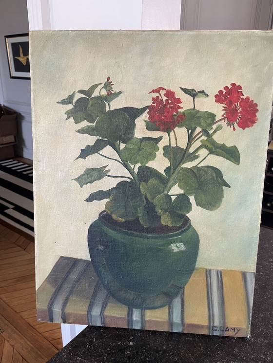 Découvrez cette magnifique huile sur toile intitulée "Géranium en Fleurs", signée par l'artiste G. Lamy. Ce tableau du XXe siècle capture avec réalisme la beauté des géraniums rouges en pleine floraison, posés dans un pot vert sur une table. Les détails minutieux et les couleurs vibrantes apportent une touche de nature et d'élégance à tout intérieur. Parfait pour les amateurs d'art et les collectionneurs, cette œuvre est prête à embellir votre espace.