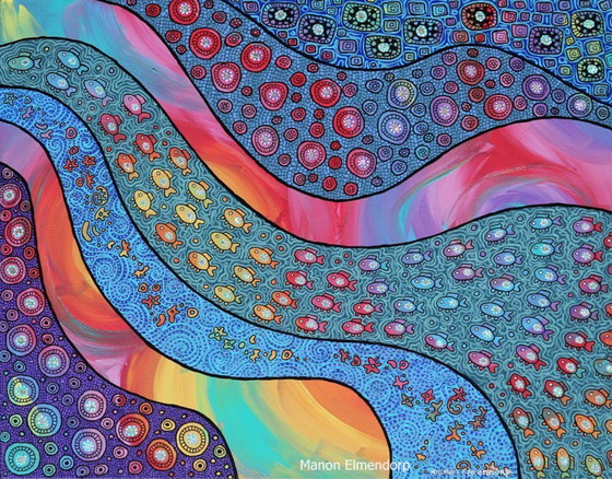 La peinture est réalisée avec une grande précision et composée de centaines de points appliqués à la main, pour un résultat original et d'une grande beauté. De petits morceaux de papier brillant sont incorporés aux poissons. Le rendu est particulièrement saisissant en réalité (bien plus beau qu'en photo !). L'ensemble de la toile est peint avec une peinture de haute qualité, résistante à la lumière.
