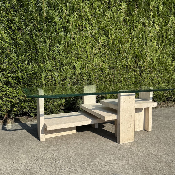 Sa base robuste en travertin est complétée par un plateau en verre élégant, créant un mélange harmonieux de texture naturelle et d'élégance moderne. Parfaite pour ceux qui apprécient l'audace et la beauté, cette table témoigne d'un design intemporel.