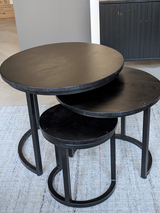 Tables basses rondes en bois et métal, finition noire élégante, alliant style et fonctionnalité. Leur design permet de les disposer ensemble ou séparément. Dimensions :