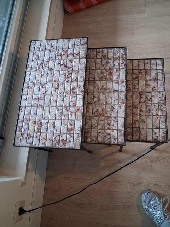 Charmantes tables d'appoint vintage des années 1960. Leur structure robuste en fonte est rehaussée de carreaux de céramique uniques, ce qui les rend à la fois fonctionnelles et décoratives. Idéales pour poser une tasse de café ou comme élément décoratif élégant dans votre salon.
