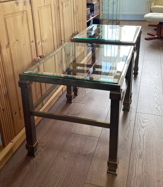 Ensemble élégant de deux tables d'appoint vintage, avec structures en métal massif (couleur laiton) et plateaux en verre taillé à facettes d'environ 0,8 cm d'épaisseur.