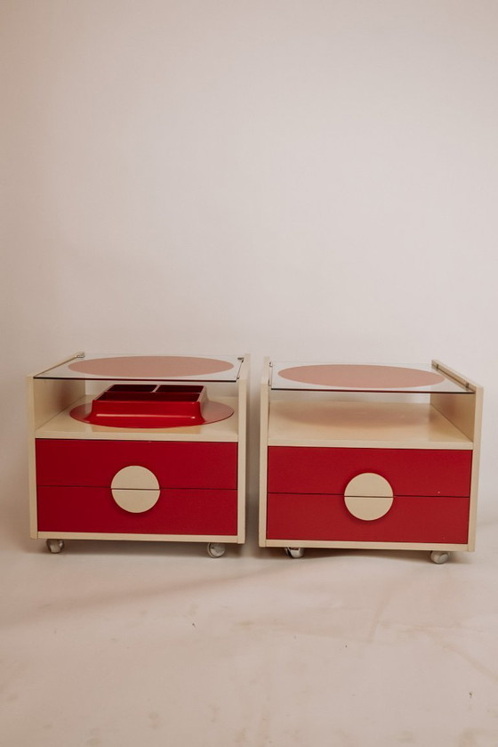 Ensemble de deux tables de chevet vintage uniques, rouges et blanches, de style futuriste des années 1960. Spacieuses, elles sont dotées chacune de deux tiroirs offrant un grand espace de rangement. Le dos de chaque table de chevet comprend également un compartiment supplémentaire, idéal pour ranger des livres, par exemple. Elles trouveront ainsi parfaitement leur place au centre d'une chambre.