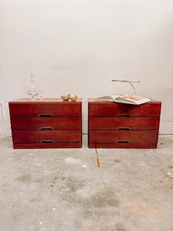 Ensemble de deux tables de chevet vintage à trois tiroirs, datant des années 1980. Fabriquées en bois foncé avec des poignées ornées de détails en laiton. Solides et en excellent état !
