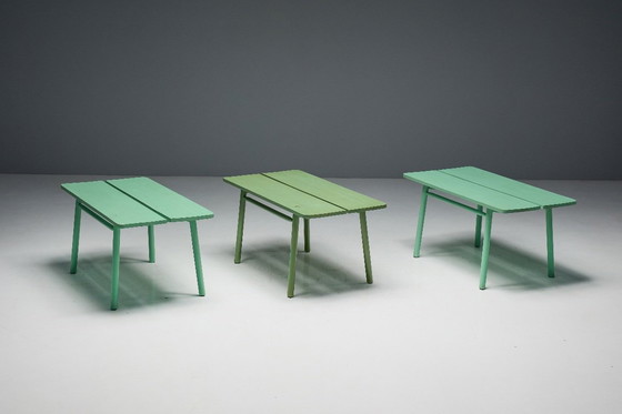 Les tables vertes "Coffee Bean" de Pierre Gautier Delaye, circa 1965, présentent un design rectangulaire minimaliste fabriqué en bois de hêtre massif. Le plateau de la table est formé de deux lattes allongées reliées par des joints de bois arrondis visibles. Les légères variations de tons verts entre les trois tables créent un aspect vivant et stratifié tout en conservant un style cohérent. Des chaises "Coffee Bean" assorties dans la même teinte verte sont également disponibles pour compléter l'ensemble. Prix par pièce.