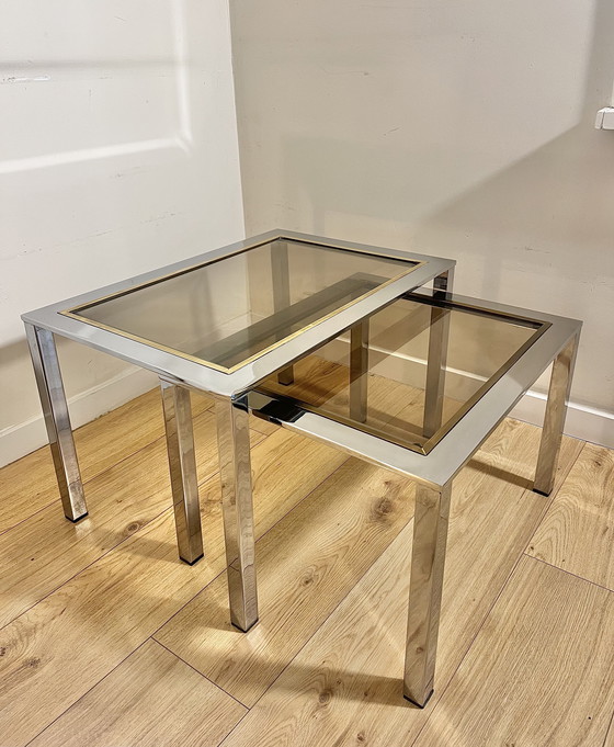 Magnifique ensemble de tables d'appoint vintage des années 80, en chrome et laiton. Leur design original les rend idéales comme tables d'appoint ou tables basses.